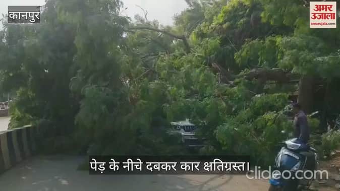 कानपुर में बीच सड़क में गिरा हरा-भरा पेड़, सड़क पर खड़ी कार गिरी…हुई क्षतिग्रस्त