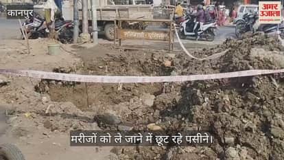 कानपुर में कांशीराम अस्पताल के बाहर सीवर लाइन की खुदाई से रास्ता बंद