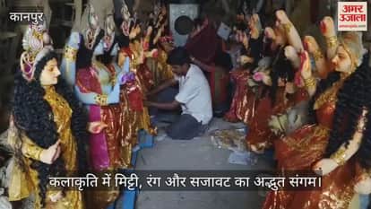 कानपुर में नवरात्रि का उत्सव नजदीक आने के साथ ही मूर्तिकार मां दुर्गा की प्रतिमाओं को अंतिम रूप देने में जुट गए हैं। साकेत नगर में मूर्तिकार गौतम पाल अपनी वर्कशॉप में बेहद खूबसूरती और बारीकी से मां दुर्गा की प्रतिमाएं तैयार कर रहे हैं। उनकी कलाकृति में मिट्टी, रंग और सजावट का अद्भुत संगम देखने को मिल रहा है। नवरात्रि शुरू होने से पहले इन मूर्तियों को पंडालों और घरों में स्थापित किया जाएगा।