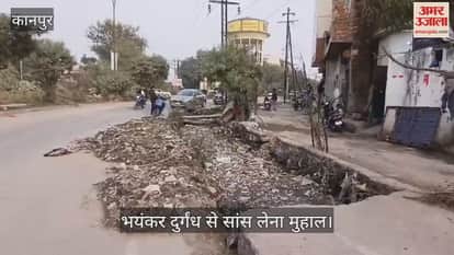 कानपुर: सिलेंडर चौराहे की सड़क पर जमा है नाले की गंदगी, राहगीरों का निकलना दूभर