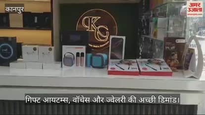 रविवार को मनाए जाने करवा चौथ के लिए कानपुर बाजार सज गए हैं। ग्राहकों की भारी भीड़ खरीदारी करने पहुंच रही है। गिफ्ट आयटम्स की अच्छी मांग हैं।अलग-अलग मोबाइल सेट्स के लिए एयर पॉड्स, वॉयरलैस माइक, स्मार्टवॉच और नेकबैंड बाजार में आए हैं। अलग-अलग कंपनियों की स्मार्ट वॉच रु.1500 से लेकर रु. 70,000 कीमत तक की हैं। इसके अलावा ज्वेलरी भी खासी पसंद की जा रही है।