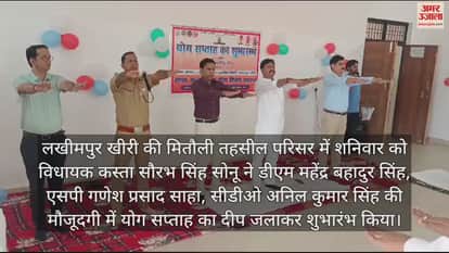 लखीमपुर खीरी की मितौली तहसील परिसर में शनिवार को विधायक कस्ता सौरभ सिंह सोनू ने डीएम महेंद्र बहादुर सिंह, एसपी गणेश प्रसाद साहा, सीडीओ अनिल कुमार सिंह की मौजूदगी में योग सप्ताह का दीप जलाकर शुभारंभ किया। सभी तहसील व ब्लाक मुख्यालयों में भी योग सप्ताह पर कार्यक्रम हुए। कार्यक्रम में विधायक, डीएम, एसपी, सीडीओ ने अधिकारी-कर्मचारियों के साथ योगाभ्यास किया। योग प्रशिक्षक कुलदीप वर्मा ने योगा प्रोटोकॉल के अनुक्रम में विभिन्न योगाभ्यास कराएं। दशम अन्तर्राष्ट्रीय योग दिवस योग स्वयं एवं समाज के लिए थीम पर व्यापक स्तर मनाया जा रहा है। विधायक सौरभ सिंह सोनू ने कहा कि योग प्राचीन भारतीय परंपरा एवं संस्कृति की अमूल्य देन है। योग अभ्यास शरीर, मन विचार कर्म आत्मसंयम एवं पूर्णता की एकात्मकता और मानव और प्रकृति के बीच सामंजस्य प्रदान करता है। स्वास्थ्य एवं कल्याण का पूर्णतावादी दृष्टिकोण है। डीएम महेंद्र बहादुर सिंह ने कहा कि योग केवल व्यायाम नहीं है, बल्कि स्वयं के साथ, विश्व और प्रकृति के बीच एकत्व खोजने का भाव है। योग सप्ताह 15 जून से 21 जून तक चलेगा।