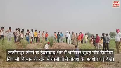 लखीमपुर खीरी के हैदराबाद क्षेत्र में शनिवार सुबह गांव देवरिया निवासी किसान के खेत में ग्रामीणों ने गोवंश के अवशेष पड़े देखे। इससे आक्रोश फैल गया। हिंदू युवा वाहिनी के पीयूष जायसवाल आशीष वाजपेई, सोनू मिश्रा, जैनेंद्र मिश्रा आदि कार्यकर्ता व ग्रामीण मौके पर पहुंचे। उन्होंने जमकर हंगामा किया। चौकीदार की सूचना पर पहुंचे थाना प्रभारी हैदराबाद दीपक तिवारी और सीओ अर्जेंद्र यादव ने घटनास्थल का निरीक्षण किया। गोवंश के अवशेष मिलने की पुष्टि की। अवशेषों को गड्ढा खुदवाकर दफना दिया गया है। थाना प्रभारी दीपक तिवारी ने बताया कि चौकीदार की तहरीर पर अज्ञात आरोपियों के खिलाफ गोवध अधिनियम के तहत अभियोग दर्ज कर उनकी तलाश शुरू कर दी गई है। कुछ संदिग्धों को हिरासत में लिया है। अवशेषों की जांच पशु चिकित्सक डॉक्टर प्रमोद वर्मा से कराई गई है।