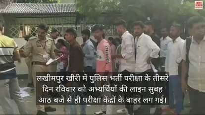 लखीमपुर खीरी में पुलिस भर्ती परीक्षा के तीसरे दिन रविवार को अभ्यर्थियों की लाइन सुबह आठ बजे से ही परीक्षा केंद्रों के बाहर लग गई। सघन तलाशी के बाद अभ्यर्थियों को केंद्रों में प्रवेश दिया गया। अभ्यर्थियों के हाथ में बंधा कलावा और धागा भी कटवा दिया गया। शहर के वाईडी कॉलेज गेट पर खुली फोटोस्टेट की दुकान पर बैग जमा करने पर 50 और 30 रुपये लेने का आरोप भी अभ्यर्थियों ने लगाया। गौरतलब है कि जिले के 15 परीक्षा केंद्रों पर पहली पाली में नौ हजार से अधिक अभ्यर्थी परीक्षा देने पहुंचे हैं। परीक्षा को लेकर कड़ी सुरक्षा व्यवस्था है।