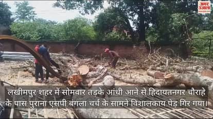 VIDEO : लखीमपुर में एसपी बंगला चर्च के सामने गिरा विशालकाय पेड़, 10 घंटे बंद रहा रास्ता