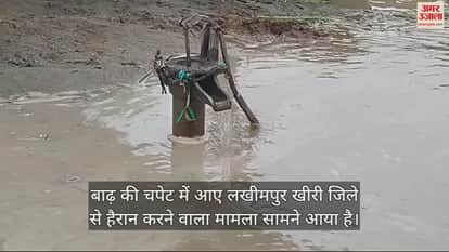 बाढ़ की चपेट में आए लखीमपुर खीरी जिले से हैरान करने वाला मामला सामने आया है। बिजुआ विकास खंड के बजेहदा गांव में बाढ़ का इतना पानी भर गया है, यहां एक हैंडपंप बिना चलाए पानी देने लगा। गांव में लगा हैंडपंप बाढ़ के पानी में आधा डूब गया है। बुधवार को नल बगैर चलाए ही पानी देने लगा, जिसे देखकर ग्रामीण दंग रह गए। ग्रामीणों ने इसका वीडियो बना लिया।