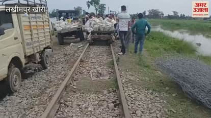 लखीमपुर खीरी में रेलवे लाइन के नीचे से पानी का रिसाव रोकने में जुटे रेलकर्मी और कारसेवक