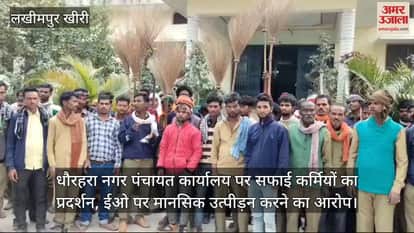 VIDEO : धौरहरा नगर पंचायत कार्यालय पर सफाई कर्मियों का प्रदर्शन, ईओ पर मानसिक उत्पीड़न करने का आरोप