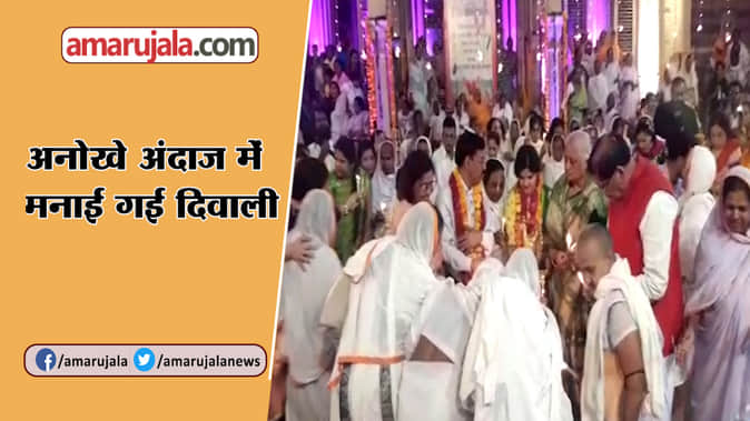 रविवार को वृंदावन के प्राचीन गोपीनाथ मंदिर प्रांगण में अनोखे अंदाज में दिवाली मनाई गई। यहां सैंकड़ों विधवाओं ने मंदिर प्रांगण में रंग-बिरंगी रोशनी के बीच दीये जलाए और रंगोली बनाई।
