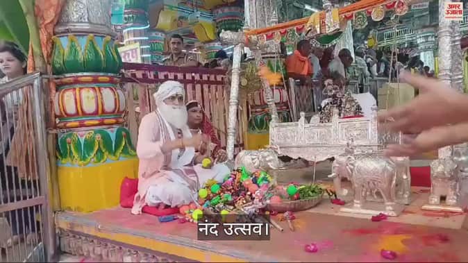 जन्माष्टमी के अगले दिन मंगलवार को मथुरा के मंदिरों में नंद उत्सव मनाया जा रहा है। इसी दौरान मंदिर ठाकुर द्वारकाधीश में नंदबाबा और यशोदा मैया के स्वरूप ने भक्तों को खेल खिलौने लुटाए और बधाई दी। भक्त जय घोष लगा रहे थे। नंद के आनंद भाए जय कन्हैया लाल की... हाथी दीने घोड़ा दीने और दीनी पालकी...।