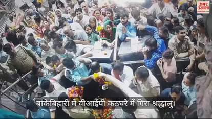 तीर्थनगरी मथुरा के वृंदावन स्थित ठाकुर बांकेबिहारी मंदिर में जहां आए दिन श्रद्धालुओं की तबीयत बिगड़ रही है, वहीं सोमवार देर शाम एक अलग तरह की घटना घटी। मंदिर के वीआईपी कठघरे में जगमोहन की रेलिंग से दर्शन कर रहा एक श्रद्धालु गिर गया। इससे मंदिर में अफरातफरी मच गई।