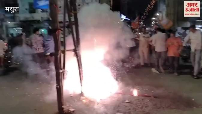 VIDEO : हरियाणा में भाजपा की हैट्रिक पर मथुरा के होलीगेट पर जश्न