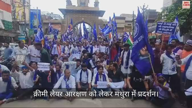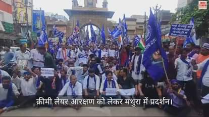 उत्तर प्रदेश के मथुरा में बुधवार को क्रीमी लेयर आरक्षण को लेकर विरोध प्रदर्शन किया गया। बड़ी संख्या में दलित युवा हाथों में नीला झंडा लेकर सड़कों पर उतरे। उन्होंने नारेबाजी करते हुए विरोध जताया। विरोध प्रदर्शन को लेकर भारत बंद का भी आह्वान किया गया था। लेकिन, यह सफल नहीं रहा।