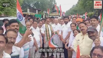 हाथों में तिरंगा और जुबां पर मां भारती के जयकारे। यह नजारा मथुरा में शनिवार को वॉक फॉर यूनिटी रैली में दिखाई दिया। अमर उजाला के अभियान ‘मां तुझे प्रणाम' के तहत वॉक फॉर यूनिटी रैली निकाली गई तो सड़कें तिरंगामय हो गईं। जगह-जगह फूलों की बारिश की गई। कार्यक्रम के मुख्य अतिथि कैबिनेट मंत्री लक्ष्मी नारायण चौधरी, विशिष्ट अतिथि जिलाधिकारी शैलेंद्र कुमार सिंह रहे।