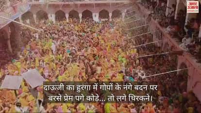 VIDEO : दाऊजी का हुरंगा में गोपों के नंगे बदन पर बरसे प्रेम पगे कोड़े... तो लगे थिरकने