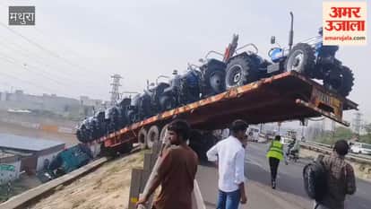 VIDEO: हाईवे पर हवा में लटक गया ट्रैक्टरों से लदा ट्राॅला, बड़ा हादसा टला; देखें वीडियो