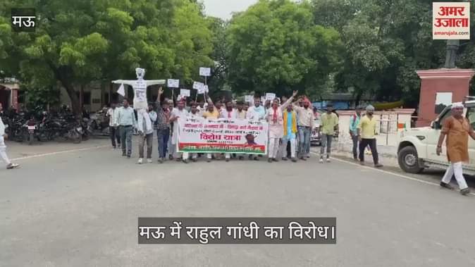 VIDEO : मऊ में भाजपाइयों ने राहुल गांधी का पुतला फूंका, जुलूस निकालकर जताया विरोध
