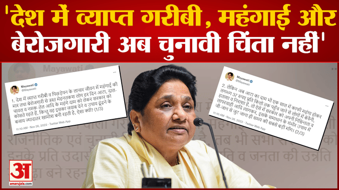 बसपा सुप्रीमो मायावती ने शनिवार को ट्वीट कर कहा कि देश में महंगाई, बेरोगजारी और गरीबी अब चुनावी और राजनीतिक चिंता नहीं रहे लेकिन फिर भी सरकारों का इन मुद्दों के प्रति उदार बने रहना उचित नहीं है। सरकार को इन समस्याओं के समाधान के लिए जीजान से जुटना चाहिए।
