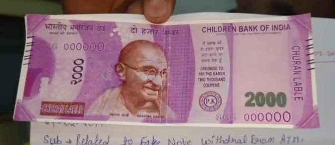 मेरठ के रहनेवाले प्राइमरी स्कूल टीचर सुनील दत्त शर्मा उस वक्त सकपका गए जब उन्हें ATM से नकली नोट मिला। सुनील ने 24 फरवरी को तेजगढ़ी चौराहे पर लगे PNB ATM से दस हजार रुपये निकाले, सभी नोट 2000 मूल्य के निकले लेकिन उसमें से एक नोट नकली भी था। 2000 के नकली नोट पर चिल्ड्रन बैंक ऑफ इंडिया और चूरन लेबल छपा था। बैंक से शिकायत करने पर कार्रवाई करने का आश्वासन दिया गया है।