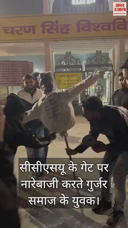 मेरठ में चौधरी चरण सिंह विश्वविद्यालय (सीसीएसयू) के गेट पर गुर्जर समाज के युवाओं और छात्रों ने समाजवादी पार्टी (सपा) नेता मुकेश सिद्धार्थ का पुतला दहन किया। इस दौरान छात्रों ने मुकेश सिद्धार्थ के खिलाफ जमकर नारेबाजी की।
