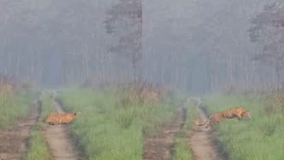पीलीभीत टाइगर रिजर्व: हिरण का शिकार करने के लिए बाघ ने लगाई दौड़, नजारा देख सैलानी हुए रोमांचित