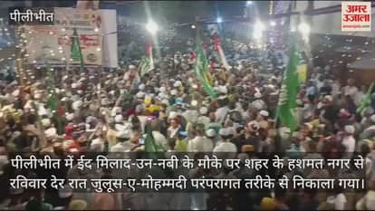 पीलीभीत में ईद मिलाद-उन-नबी के मौके पर शहर के हशमत नगर से रविवार देर रात जुलूस-ए-मोहम्मदी परंपरागत तरीके से निकाला गया। इस दौरान जगह-जगह लोगों ने जुलूस का स्वागत किया। जुलूस के दौरान पुलिस प्रशासन मुस्तैद रहा और सुरक्षा के कड़े इंतजाम दिखे। हशमत नगर में आस्तान-ए-हशमतिया से सज्जादानशीन मौलाना जरताब रजा खां की रहनुमाई में जुलूस निकाला गया। जुलूस हशमतनगर से शुरू होकर बेलो वाले चौराहा, कमल्ले चौराहा, छोटी मार्केट, शाहजी मियां मजार, जामा मस्जिद, चौक बाजार,सुनहरी मस्जिद चौराहा, फीलखाना पंजाबियान,जाटो वाला चौराहा होता हुआ सोमवार सुबह वापस हशमत नगर में आकर समाप्त हुआ। जुलूस के दौरान कई जगह तकरीरें की गईं। जिसमें मौलानाओं ने मोहम्मद साहब के बताए रास्ते पर चलने को कहा। जुलूस को लेकर पुलिस-प्रशासनिक अफसर खासा अलर्ट दिखे। एएसपी विक्रम दहिया, सिटी मजिस्ट्रेट विजय वर्धन तोमर, सीओ सिटी दीपक चतुर्वेदी, कोतवाल नरेश त्यागी समेत अफसर निगाह बनाए रहे।