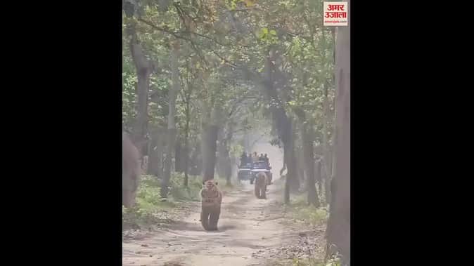 VIDEO : पीलीभीत टाइगर रिजर्व में पर्यटकों की जिप्सी के सामने अचानक आ गए दो बाघ
