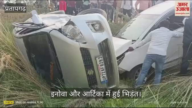 VIDEO : इनोवा और अर्टिगा में हुई भिड़ंत, हादसे के बाद खड्ड में गिरे दोनों वाहन, कोई हताहत नहीं