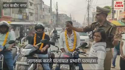 संत कबीर नगर के यातायात प्रभारी परमहंस द्वारा खलीलाबाद शहर क्षेत्र व बरदहिया बजार में लोगों को यातायात जागरुकता के नियमों की जानकारी दी गई।हेलमेट लगाने वाले दो पहिया वाहन चालकों को माल्यार्पण किया और यातायात के प्रति जागरुक करने के लिए रिफ्लेक्टर लगाया। नाबालिग बच्चों को वाहन न चलाने, तीन सवारी न बैठने, बिना नम्बर प्लेट लगी वाहन न चलाने, नशे की हालत में गाड़ी न चलाने, वाहन को ओवर स्पीड़ से न चलाने के बारे में जानकारी दी गई।