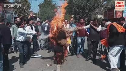 VIDEO : शाहजहांपुर में अबू आजमी के खिलाफ प्रदर्शन, हिंदू जागरण मंच ने फूंका पुतला