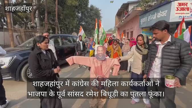 VIDEO : शाहजहांपुर में कांग्रेस की महिला कार्यकर्ताओं ने भाजपा के पूर्व सांसद रमेश बिधूड़ी का पुतला फूंका