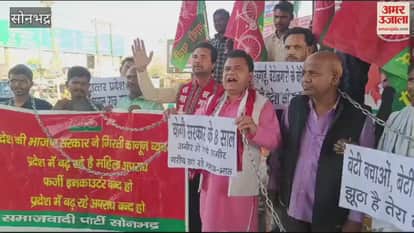 प्रदेश में भाजपा सरकार के आठ साल पूरा होने पर सपा कार्यकर्ताओं ने सोमवार को नगर के स्वर्ण जयंती चौक पर प्रदर्शन किया। कार्यकर्ताओं ने खुद को बेड़ियों में जकड़कर दिखाया कि भाजपा सरकार में जनता भी बेरोजगाई, महंगाई की जंजीरों से बाहर नहीं निकल पाई है।