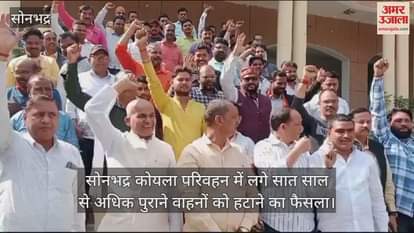 VIDEO : सोनभद्र में नए आदेश पर ट्रक मालिकों का विरोध, कलेक्ट्रेट में किया प्रदर्शन, सात साल पुराने वाहनों को कोल परिवहन से रोकना अनुचित