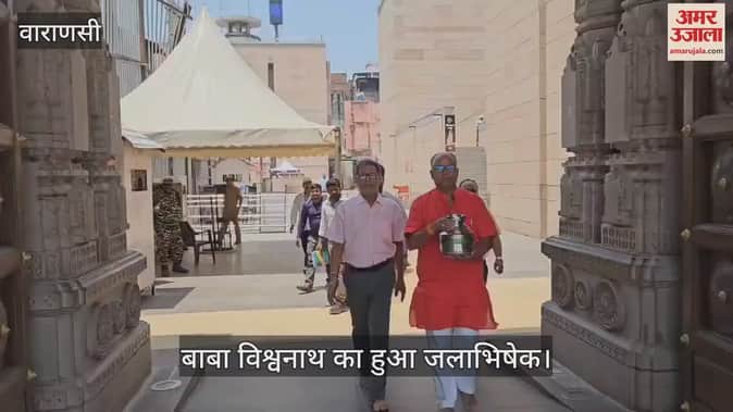 काशी विश्वनाथ धाम में मध्यान भोग आरती के बाद जनकल्याण एवं विश्वशांति के पवित्र संकल्प के साथ त्रिवेणी संगम के जल से बाबा का विधिपूर्वक जलाभिषेक किया गया।