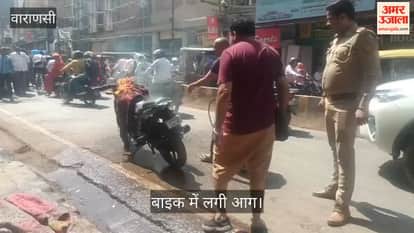VIDEO: वाराणसी में चेतगंज मार्ग पर बाइक में लगी आग