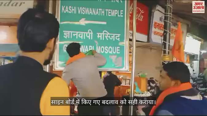 VIDEO : ज्ञानवापी परिसर में पूजा का आदेश आने के बाद साइन बोर्ड में लगाया मंदिर का स्टीकर, बदलाव को सही कराया
