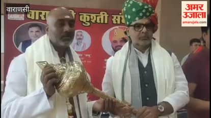 सिगरा स्टेडियम में वाराणसी कुश्ती संघ के निर्विरोध निर्वाचित अध्यक्ष राजीव सिंह 'रानू' को गदा प्रदान पद का दायित्व सौंपते निवर्तमान अध्यक्ष वाराणसी कुश्ती संघ के वर्तमान अध्यक्ष भारतीय कुश्ती संघ के अध्यक्ष संजय सिंह 'बबलू'।