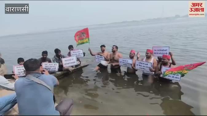 VIDEO : सपाजनों ने किया अर्धनग्न प्रदर्शन, गंगा में खड़े होकर बताई थाली, बोले- BJP के लिए महंगाई बनी भाैजाई