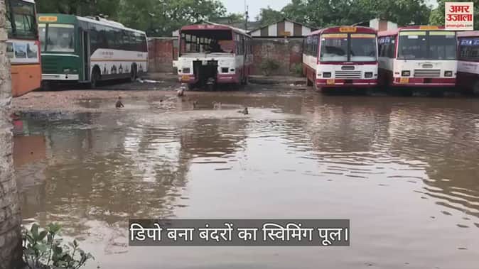 पहली ही बारिश में बनारस के कई इलाकों में पानी भरा है। कहीं सड़क धंस गई, तो कहीं नाले जाम हो गए। वहीं वाराणसी रोडवेज डिपो में जलभराव से तालाब सा नजारा दिखा। भरे हुए पानी में बंदर नहाते नजर आए।
