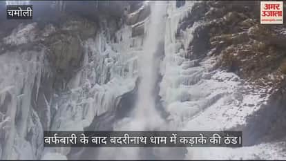 VIDEO : बर्फबारी के बाद अब बदरीनाथ धाम में कड़ाके की ठंड...जम गया इंद्र धारा का पानी