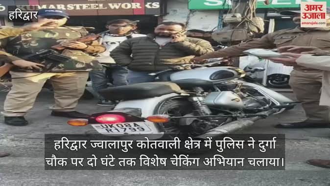 हरिद्वार ज्वालापुर कोतवाली क्षेत्र में पुलिस ने दुर्गा चौक पर दो घंटे तक विशेष चेकिंग अभियान चलाया। इस दौरान उत्तराखंड शासन लिखी हुई एक एसयूवी कार को पकड़ा। चालक को फटकार लगाते हुए चालान किया। इसके अलावा पटाखे की आवाज करने वाले साइलेंसर लगाने पर तीन बुलेट बाइक भी सीज कर दी गई। 26 वाहनों के चालान कर 11 हजार 500 रुपये का जुर्माना वसूला गया। कोतवाली प्रभारी कुंदन सिंह राणा की अगुवाई में चलाए गए अभियान में पुलिस और पीएसी के जवान शामिल रहे। अभियान दोपहर 2:30 बजे शुरू होकर 4:30 बजे तक चला। इस दौरान कुल 305 वाहन चेक किए गए, जिनमें 135 कार व छोटा हाथी व 170 दोपहिया वाहन शामिल थे। इंस्पेक्टर केडी राणा ने बताया कि पुलिस ने नियमों का उल्लंघन करने पर 26 चालान काटे और कुल 11,500 रुपये जुर्माना वसूला। अभियान में मोडिफाइड साइलेंसर लगाकर फर्राटा भर रहे तीन बुलेट मोटरसाइकिलों को मौके पर ही सीज कर दिया गया। एक कार उत्तराखंड शासन की नाम की अवैध तरीके से पट्टी लगाने पर चालानी कार्रवाई की गई। नाम पट्टी उतारी गई। 81 पी एक्ट में छह चालान किए गए, जिनसे 1500 रुपये संयोजन शुल्क वसूला गया। चेकिंग दौरान पुलिस को कोई संदिग्ध वस्तु या व्यक्ति नहीं मिला। क्षेत्र में सुरक्षा व्यवस्था और यातायात अनुशासन बनाए रखने के लिए लगातार अभियान चलाया जाएगा।