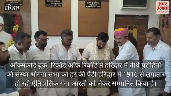 ऑक्सफोर्ड बुक रिकॉर्ड ऑफ रिकॉर्ड ने हरिद्वार में तीर्थ पुरोहितों की संस्था श्रीगंगा सभा को हर की पैड़ी हरिद्वार में 1916 से लगातार हो रही ऐतिहासिक गंगा आरती को लेकर सम्मानित किया है। आज विधिवत रूप से ऑक्सफोर्ड बुक ऑफ रिकॉर्ड्स में श्री गंगा सभा द्वारा आयोजित गंगा आरती का नाम दर्ज हो गया है यह श्री गंगा सभा और हरिद्वार वासियों के लिए और उत्तराखंड के लिए एक बहुत बड़ी उपलब्धि है। आज हर की पैड़ी हरिद्वार में ब्रह्मा कुंड परिसर में स्थित गंगा सभा के मुख्य कार्यालय में ऑक्सफोर्ड बुक्स ऑफ रिकॉर्ड्स के भारत में प्रतिनिधि और संरक्षक पंडित सुरेश मिश्रा ने एक आयोजन में श्री गंगा सभा के अध्यक्ष पंडित नितिन गौतम और श्री गंगा सभा के महामंत्री पंडित तन्मय वशिष्ठ तथा अन्य पदाधिकारी को यह सम्मान प्रदान किया। श्री गंगा सभा को इस अवसर पर प्रमाण पत्र भेंट किया गया। सुरेश मिश्रा ने बताया कि जून 2026 में ऑक्सफोर्ड यूनियन लंदन के कार्यालय में एक बड़े समारोह में श्री गंगा सभा के प्रतिनिधियों को आमंत्रित कर विधिवत् रूप से सम्मानित किया जाएगा और इस अलंकरण से नवाजा जाएगा। मिश्रा ने बताया कि गंगा सभा 1916 से लगातार हरिद्वार में गंगा आरती का आयोजन कर रही है और कोरोना काल में भी निरंतर आरती होती रही।