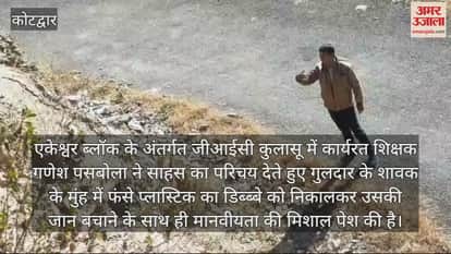 एकेश्वर ब्लॉक के अंतर्गत जीआईसी कुलासू में कार्यरत शिक्षक गणेश पसबोला ने साहस का परिचय देते हुए गुलदार के शावक के मुंह में फंसे प्लास्टिक का डिब्ब्बे को निकालकर उसकी जान बचाने के साथ ही मानवीयता की मिशाल पेश की है। शिक्षक गणेश पसबोला ने बताया कि बृहस्पतिवार सुबह 10:50 बजे वह कक्षा में बच्चों को पढ़ा रहे थे। तभी खेल मैदान के बाहर उन्हें छात्र-छात्राओं व अन्य शिक्षकों की आवाज़ सुनाई दी। वह कक्षा से बाहर आए तो उन्हें खेल मैदान के पास गुलदार का एक शावक दिखाई दिया, जिसके मुंह में प्लास्टिक का डिब्बा फंसा हुआ था। इस कारण शावक को दिखाई नहीं दे रहा था और वह इधर-उधर भटक रहा था। शिक्षक गणेश ने साहस का परिचय देते हुए शावक के मुंह से प्लास्टिक हटाकर उसकी जान बचाकर मानवता की मिशाल पेश की। उन्होंने बताया कि शावक को बचाने के पहले प्रयास में शावक उछल गया, लेकिन दूसरे प्रयास में वो प्लास्टिक के डिब्बे को निकालने में सफल हो गए।