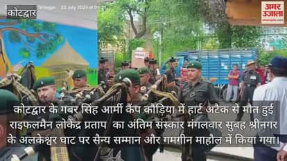 कोटद्वार के गबर सिंह आर्मी कैंप कौड़िया में हार्ट अटैक से मौत हुई राइफलमैन लोकेंद्र प्रताप का अंतिम संस्कार मंगलवार सुबह श्रीनगर के अलकेश्वर घाट पर सैन्य सम्मान और गमगीन माहौल में किया गया। इस दौरान परिजनों सहित बड़ी संख्या में लोगों ने उन्हें श्रद्धांजलि अर्पित की। पौड़ी जिले की तहसील श्रीनगर के गांव कटाखोली, पट्टी चलणस्यूं निवासी लोकेंद्र प्रताप (26) गढ़वाल राइफल्स की 21वीं बटालियन में आठ वर्ष पहले भर्ती हुए थे। इस समय वे जम्मू-कश्मीर में तैनात थे और एक हफ्ते पहले प्रशिक्षण के लिए गबर सिंह आर्मी कैंप कौड़िया आए हुए थे। रविवार रात वह भोजन कर सोए, सोमवार सुबह जब वे नहीं उठे तो साथी सैनिक कैंप में पहुंचे। वहां वह अचेत अवस्था में मिले। उन्हें तुरंत बेस अस्पताल ले जाया गया। जहां चिकित्सक ने मृत घोषित कर दिया था।