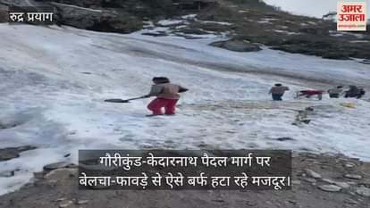 VIDEO : गौरीकुंड-केदारनाथ पैदल मार्ग पर बेलचा-फावड़े से ऐसे बर्फ हटा रहे मजदूर