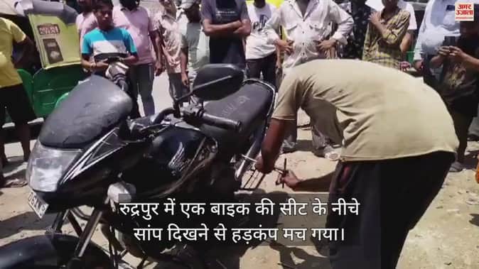 रुद्रपुर में एक बाइक की सीट के नीचे सांप दिखने से हड़कंप मच गया। इस दौरान वहां लोगों की भीड़ जमा हो गई। मैकेनिकल ने बाइक की सीट को खोला और सांप को बाहर निकाला।
