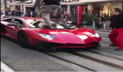 MAN CLIMBS ON ROOF OF 5 CRORE RUPEE LAMBORGHINI AVENTADOR FOR FUN OWNER PUNCHES KNOCKS HIM OUT