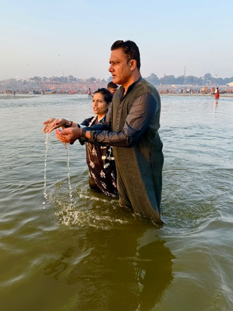 कुंभ पहुंचे पूर्व स्पिनर अनिल कुंबले, पत्नी के साथ लगाई आस्था की डुबकी भारतीय टीम के पूर्व स्पिनर अनिल कुंबले बुधवार को अपनी पत्नी चेतना रामतीर्थ के साथ प्रयागराज के महाकुंभ पहुंचे। माघ पूर्णिमा के अवसर पर दिग्गज खिलाड़ी ने कुंभ में पत्नी के साथ आस्था की डुबकी लगाई। इसकी तस्वीरें उन्होंने अपने सोशल मीडिया हैंडल से साझा कीं। इसके साथ उन्होंने कैप्शन लिखा- सौभाग्यपूर्ण। कुंबले से पहले पूर्व क्रिकेटर सुरेश रैना भी कुंभ पहुंचे थे। उन्होंने भी पत्नी के साथ प्रयागराज पहुंचकर आस्था की डुबकी लगाई थी। बता दें कि, अनिल कुंबले भारतीय टीम के पूर्व स्पिनर के अलावा टीम के हेड कोच भी रहे हैं। उन्होंने 2016-17 के बीच यह पद संभाला था। कुंबले ने अपने अंतरराष्ट्रीय करियर में 132 टेस्ट और 271 वनडे मैच खेले। वह भारत के लिए टेस्ट और वनडे में सबसे ज्यादा विकेट चटकाने वाले गेंदबाज हैं। b