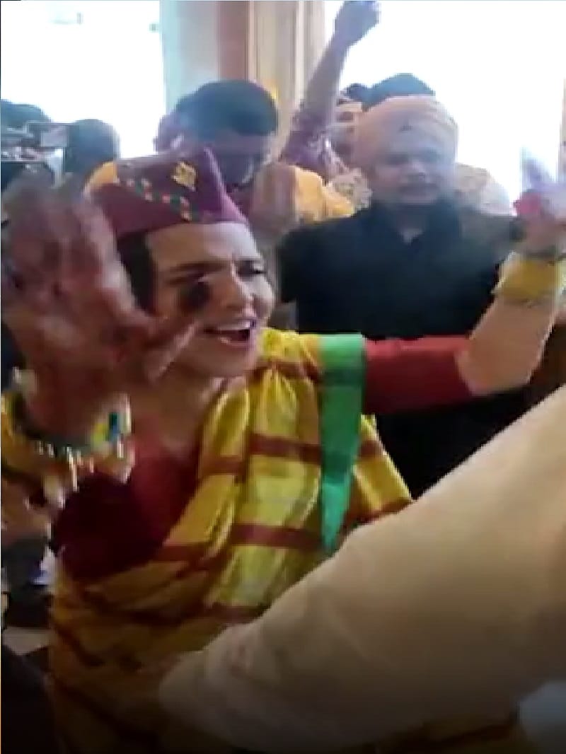चक दे गर्ल चित्राशी रावत ने मेंहदी समारोह में लगाए ठुमके उत्तराखंड के देहरादून की ये हसीना अभिनेता ध्रुवादित्य के साथ सात फेरे लेंगी। शुक्रवार को मेंहदी समारोह का आयोजन हुआ, जिसमें पहाड़ी टोपी पहने चित्राशी का डांस करते वीडियो खूब वायरल हो रहा है। शनिवार को चित्राशी, ध्रुवादित्य के साथ शादी के बंधन में बंध जाएंगी। ध्रुवादित्य ने रेडियो जाकी के रूप में अपना करियर शुरू किया था। चित्रांशी ओलंपिक खेलना चाहती थी लेकिन बॉलीवुड की हसीना बन गईं, वह अपने कॉलेज डेज में अच्छी खिलाड़ी रही हैं। देहरादून की हॉकी प्लेयर चित्राशी रावत को उनके खेल ने ही 'चक दे इंडिया' में रोल दिलवाया। चित्राशी रावत ने 2007 सात में 'चक दे इंडिया' फिल्म से बॉलीवुड में कदम रखा था। यहां--