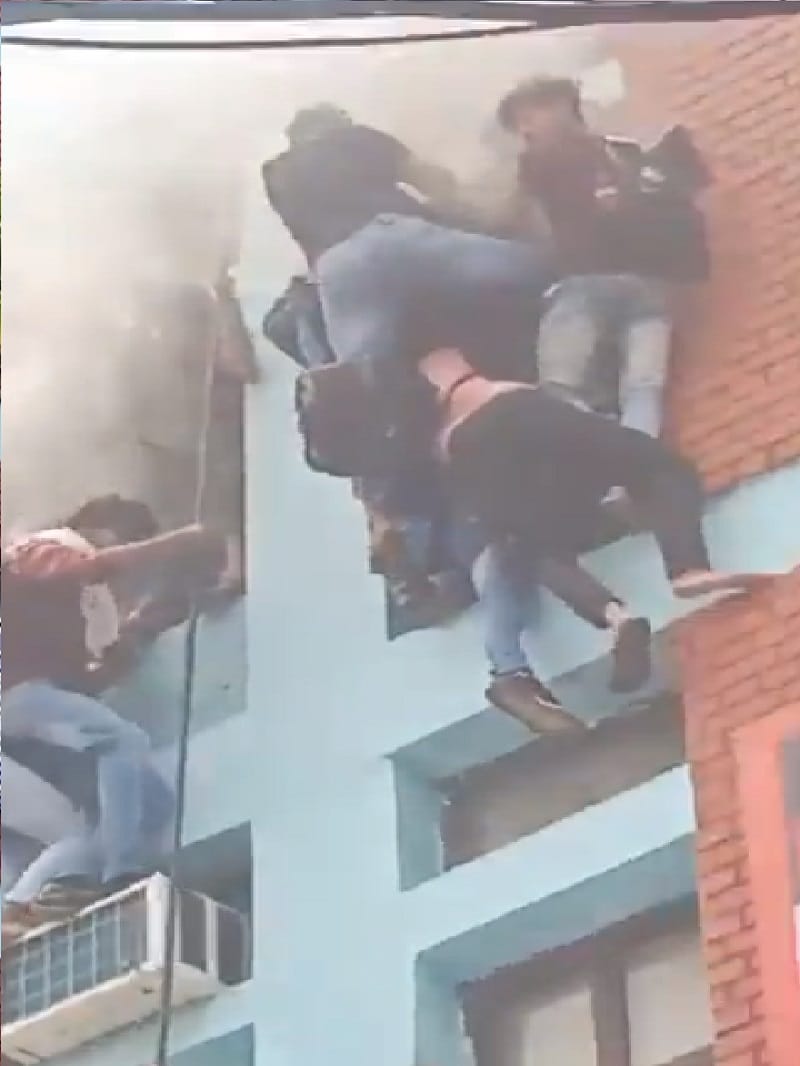 कूदते-फांदते और रस्सी के सहारे बच्चों ने बचाई जान, अग्निकांड की गवाह ये तस्वीरें दिल्ली के मुखर्जी नगर इलाके में स्थित एक कोचिंग सेंटर की तीसरी मंजिल पर आग लगने से अफरातफरी मच गई। आग लगने के बाद कोचिंग सेंटर में मौजूद छात्र रस्सी के सहारे नीचे उतरकर जान बचाते हुए दिखे। इस घटना का वीडियो सोशल मीडिया पर तेजी से वायरल हुआ, जिसमें छात्र गिरते-पड़ते और रस्सी से झुलते हुए जान बचाते दिख रहे। वीडियो में देखा जा सकता है, कैसे एक के बाद एक छात्र रस्सी से नीचे बाहर की तरफ लटके हुए हैं और नीचे की तरफ एक के बाद एक उतर रहे हैं। बता दें कि मुखर्जी नगर में बत्रा सिनेमा के पास गयाना भवन है, जहां पर आग लगी है। सूचना पर एक के बाद एक दमकल कई गाड़ियां घटनास्थल पर पहुंचीं और राहत-बचाव अभियान में तत्परता से जुट गईं। जानकारी के अनुसार, जिस समय कोचिंग सेंटर में आग लगी उस समय करीब 400 छात्र वहां मौजूद थे। ुा